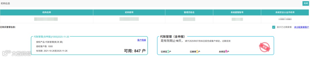 全新设计的卡片,能清晰区分旧套餐与新套餐。卡片上展示了机构名称、税号、管理员信息等基础内容,还详细列出已购买套餐信息,包括授权产品、客户数、有效期、已绑定、已解绑和未绑定客户数量等,让机构对自身套餐使用情况一目了然。