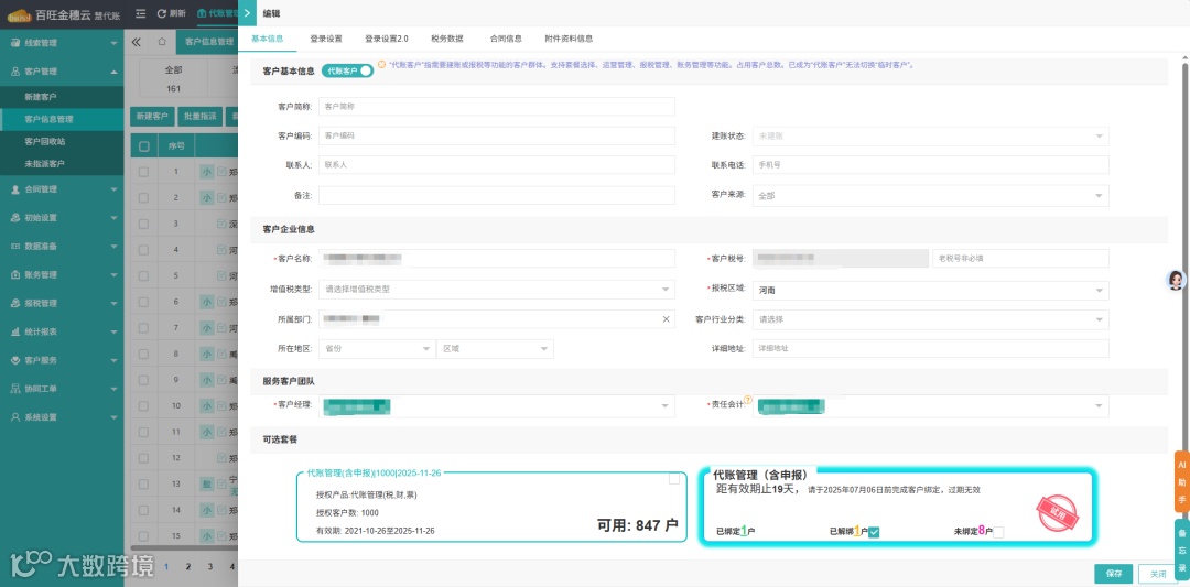 同样采用全新样式,在新建或编辑客户时,页面布局更加合理。客户基本信息、企业信息、账务管理、报税管理等板块划分清晰,方便用户填写和查看。同时,可选套餐区域也进行了优化,同一产品套餐自动汇总,最多显示1-3个新套餐卡片,告别旧版十几张卡片的繁杂选择,快速定位合适套餐。