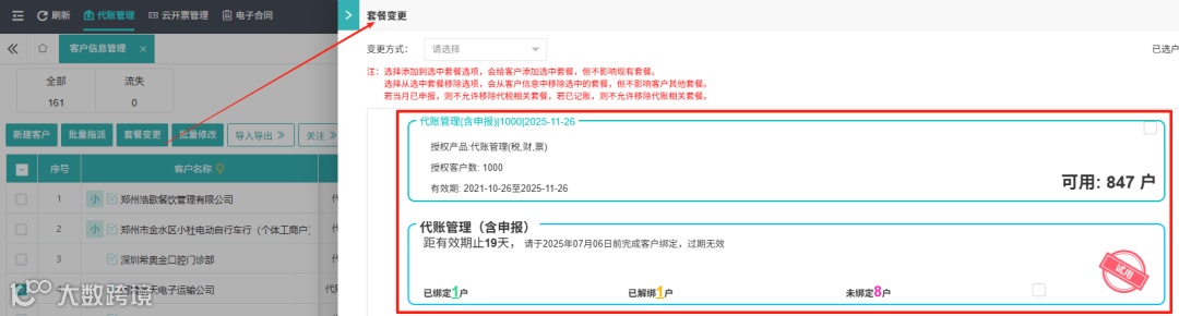 对于已做过账、报过税的客户,进行“删除”“流失”“编辑”“批量更换套餐”“批量解绑套餐”操作后,相关额度次月会恢复到“已解绑”状态,相比之前不再阻断额度复用,提升了资源利用率。