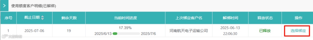 在【新建客户】页面选择套餐时,有两种便捷方式。既可以点击整个卡片选择“未绑定”额度,也能点击“已解绑”后面下划线彩色数字,查看使用额度客户明细(已解绑),从中选择合适的时间进行绑定,操作更加灵活。