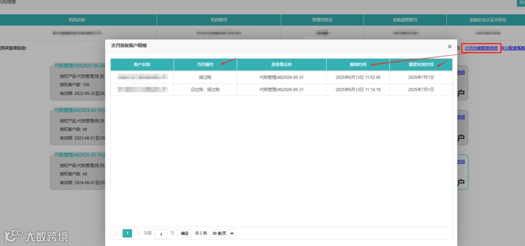 右上角【机构信息】中点击“次月恢复额度明细”可弹窗查看因“删除”“流失”“编辑”“批量更换套餐”“批量解绑套餐”操作解绑套餐,同时触发“额度次月恢复机制”的客户。表格包含:客户名称、当月操作、原套餐名称、解绑时间、额度恢复时间字段,可直观了解到未恢复额度的客户明细。