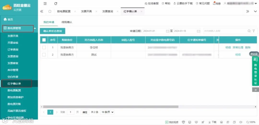 如需确认负数发票开具状态,可点击【数电票管理】-【红字确认单】进行查询确认。数电票默认申请红字确认单后,自动开具红字发票。部分无法直接开具负数发票的红字确认单,经购销双方确认后,点击【冲红开具】即可。