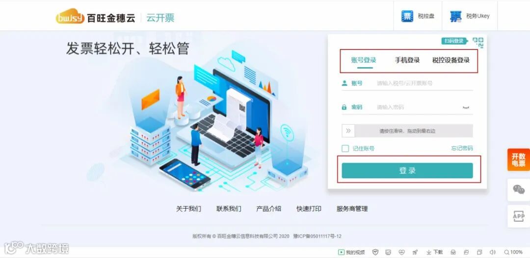 在浏览器中输入http://yun.baiwangjs.com进入百旺金穗云-云开票网站,您可以选择账号登录、手机登录或税控设备登录。账号登录即输入税号、密码,拖动滑块验证, 点击【登录】;手机登录即输入已绑定手机号,及验证码,点击【登录】;税控设备登录即插入税控设备,启动云票助手,输入设备口令、证书口令,点击【登录】。