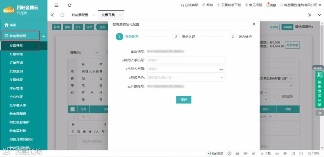 初次使用云开票开票时,点击【数电票管理】-【发票开具】,进入发票开具界面。按系统引导,进行“登录配置”、“身份认证”、“销方维护”,完成开票初始化配置。如下图: