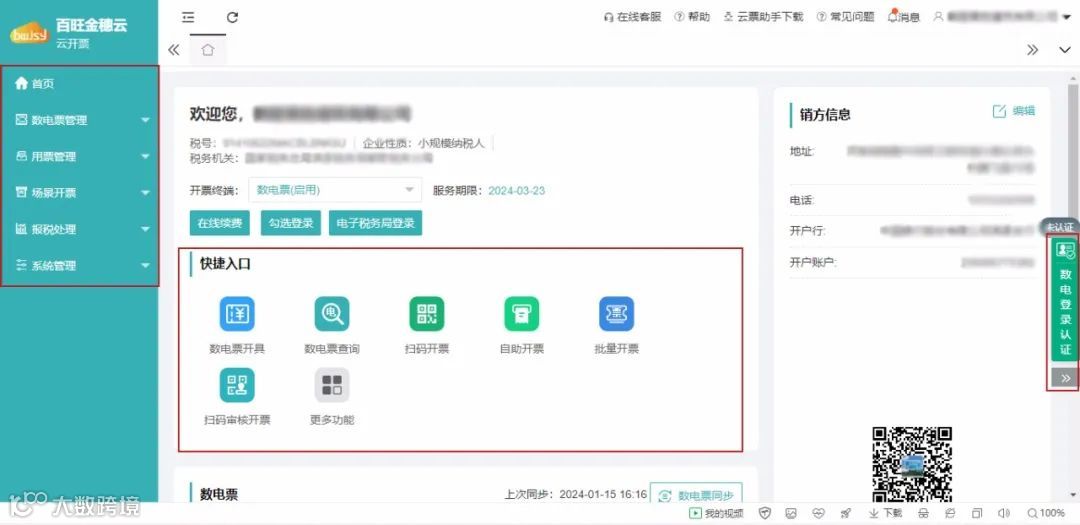 云开票首页分为功能导航、企业基础信息、功能快捷入口、发票统计数据、销方信息及服务版块。