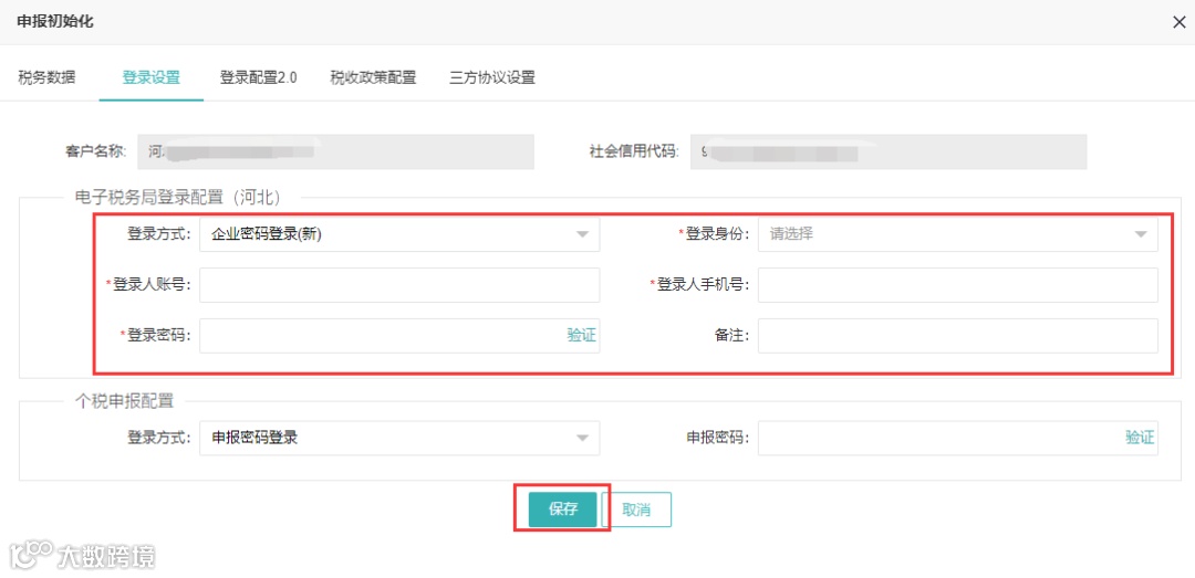 ⑤ 设置个税申报配置:登录方式及密码;点击【保存】;