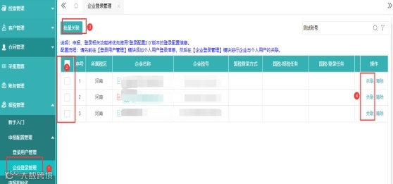 ① 点击【企业登录管理】勾选客户点击【批量管理】或者单户【关联】;