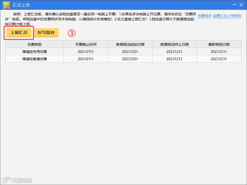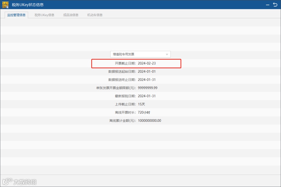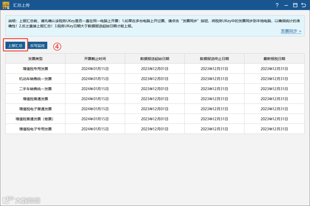 操作流程:重新打开汇总上传界面,查看各发票类型开票截止时间是否更新到下月中旬,若更新,说明操作成功。