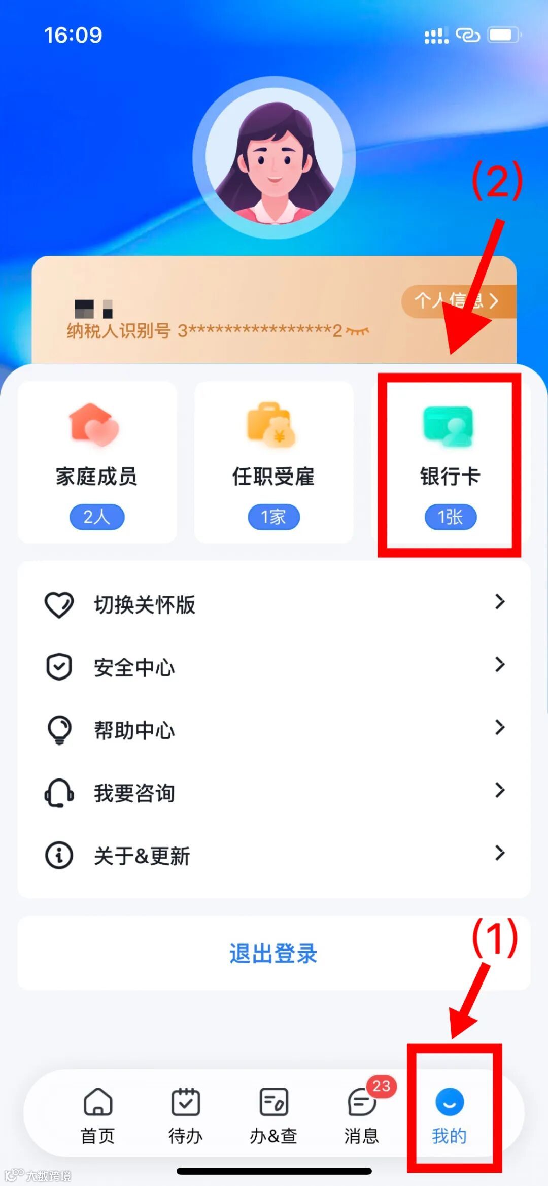1.打开个税APP应用后,点击【我的】,进入个人中心界面,点击【银行卡】,选中要解绑的银行卡。