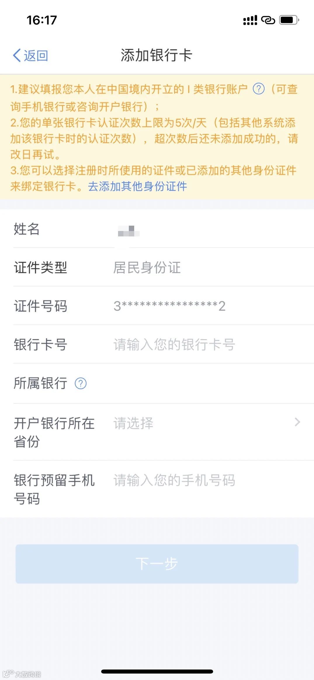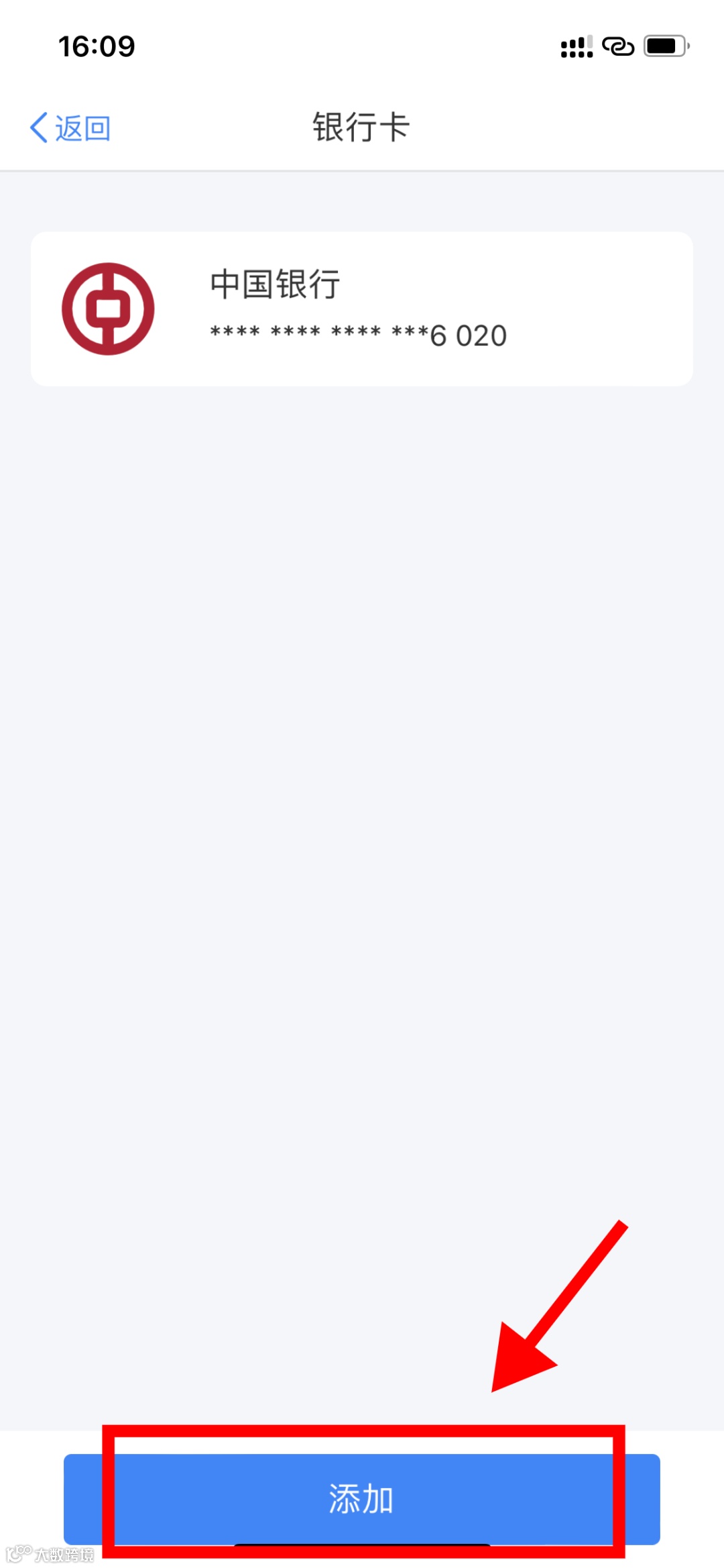 进入【银行卡】后,点击【添加】进入“添加银行卡”界面,按提示完成信息填录与身份验证后即完成新银行卡的绑定。