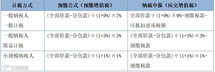 预缴增值税:(总包款-分包款)÷(1+9%)*2%=(50-30)/(1+9%)*2%=0.37万元