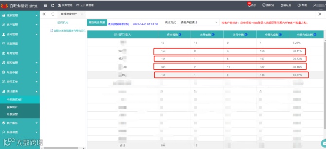 这是一家代理记账公司的大征期申报进度统计,代账户数大约900,财务人员大约4人,申报完成率人均95%以上,仔细分析,你会发现这家公司的人工运营成本较低,工作效率较高。