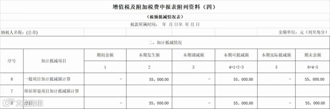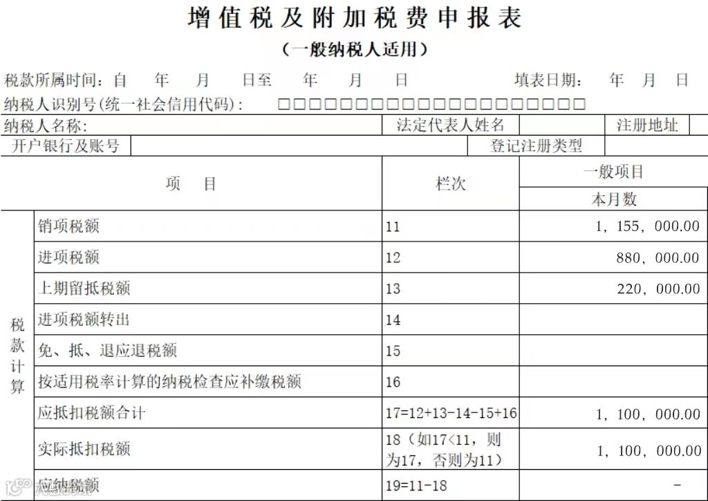 注意:根据《增值税及附加税费申报表(一般纳税人适用)》及其附列资料填写说明,适用加计抵减政策的纳税人,19栏按以下公式填写:第19栏“一般项目”列“本月数”=第11栏“销项税额”“一般项目”列“本月数”-第18栏“实际抵扣税额” “一般项目”列“本月数”-“实际抵减额”,即19栏=115.5-110-5.5=0。