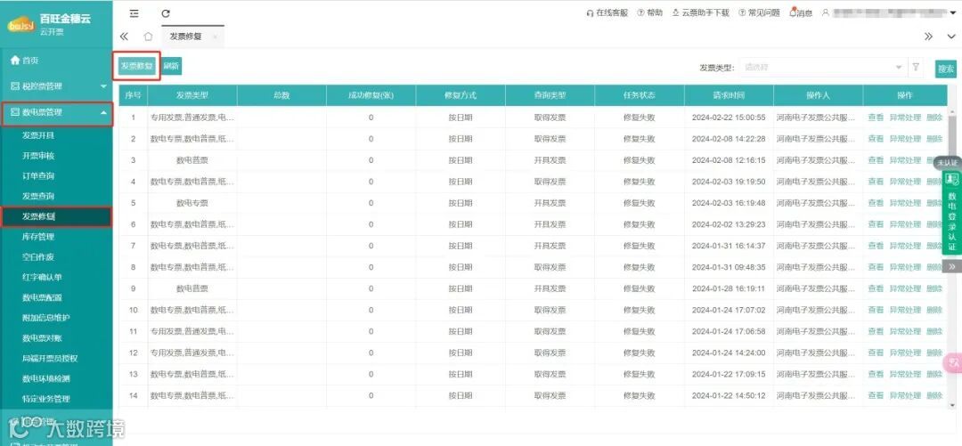 在云开票中,如果想查询往期开过的税控票及数电票,那么可以用修复功能选择票种和日期进行修复,即可同步之前开具的发票;或当开票时出现发票开具失败的情况,也可以先进行发票修复,再进行异常处理,重新提交开具,避免重复开具等问题。