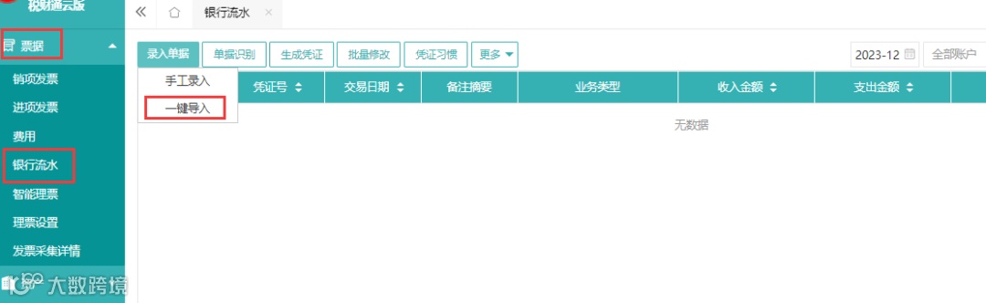 1.点击【票据】-【银行流水】,点击录入单据【一键导入】;