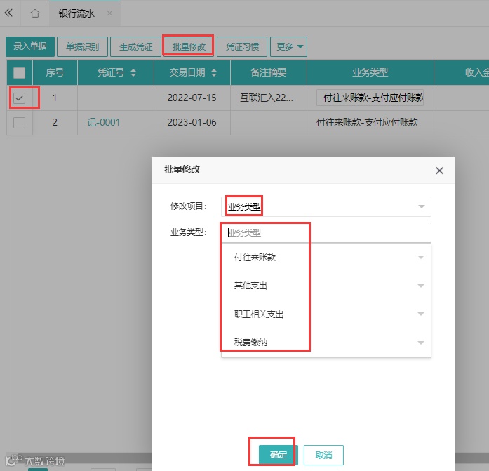 5、勾选流水,点击上方【批量修改】,修改项目选择“业务类型”,设置业务类型,点击【确定】;