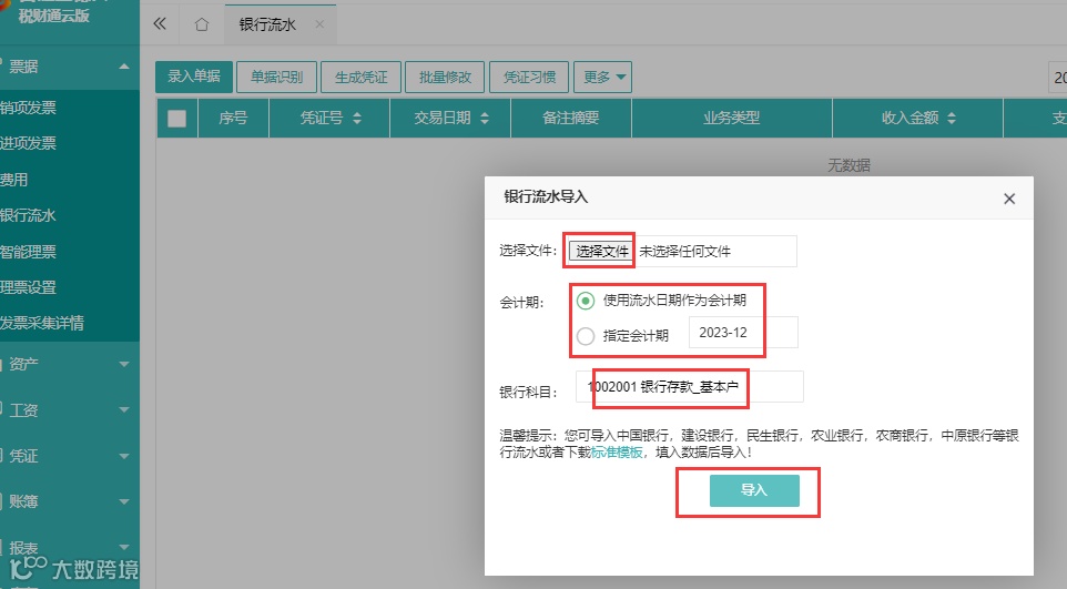 2、选择需导入的文件,选择会计期(使用流水日期作为会计期、指定会计期),选择银行科目,点击【导入】;