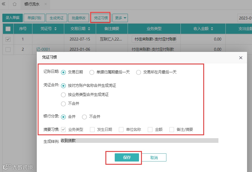 6、可点击【凭证习惯】设置记账日期、凭证合并、银行分录、摘要习惯,点击【保存】;