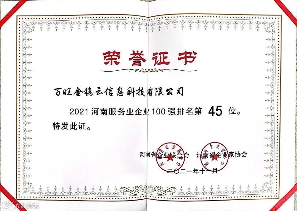 喜讯!百旺金穗云入选2021河南服务业企业100强