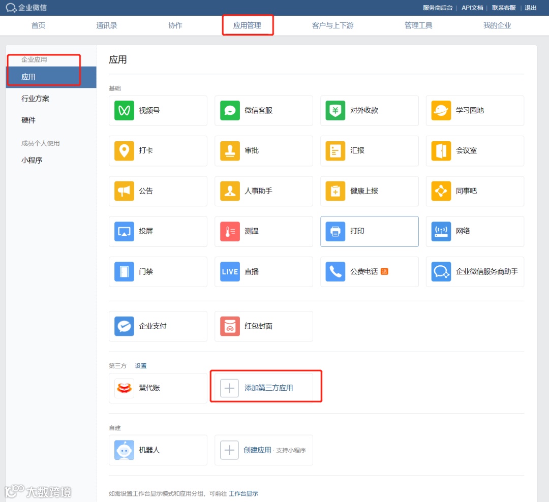 代账公司可以在PC端和手机安装企业微信客户端,企业微信后台,第三方应用市场搜索慧代账,进行添加应用,选择可见范围即可。