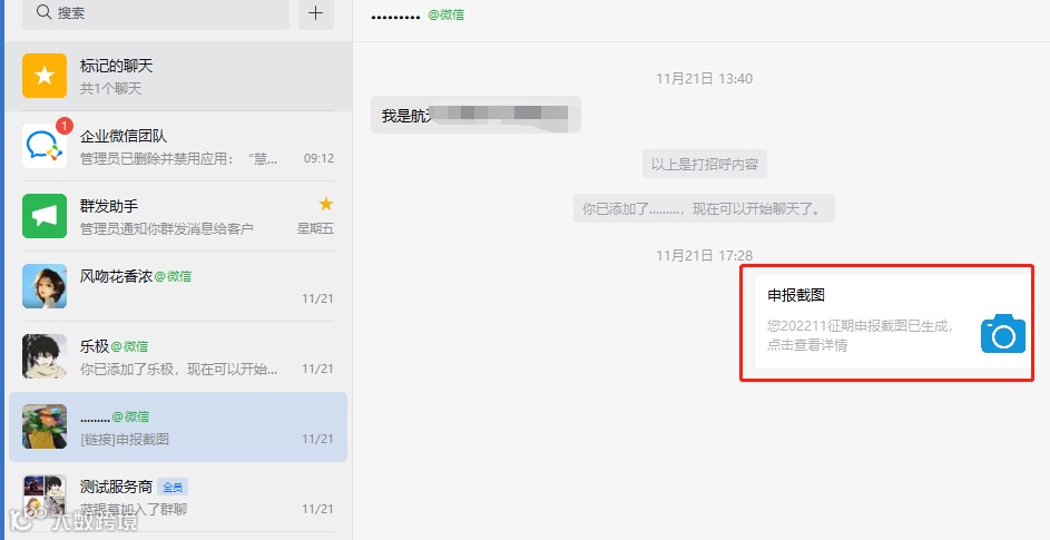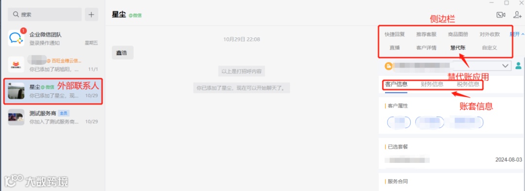 添加代账企业的联系人为企业微信好友,可以在聊天界面侧边栏中点击慧代账应用,登录慧代账查看代账企业的信息,并发给企业。