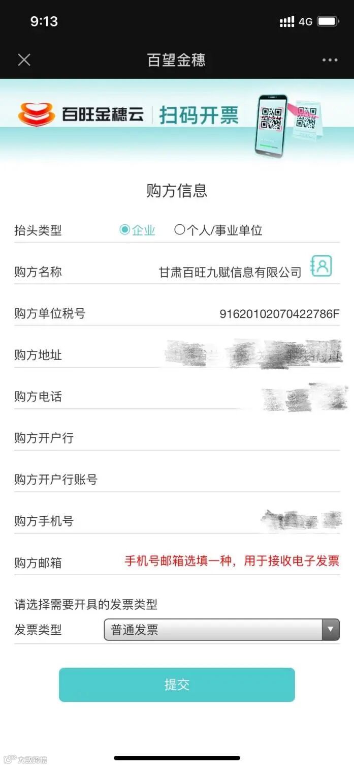 在开具发票时,我们可以让客户直接扫码进行填写对方开票信息,填写完成以后点击提交即可!如下图所示: