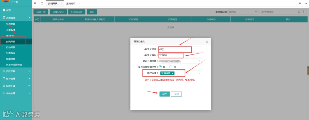 我们可以直接点击码牌下载,也可以在码牌自定义模块进行添加我们想要添加的名称,比如自定义名称、编码号、发票的种类选择等!