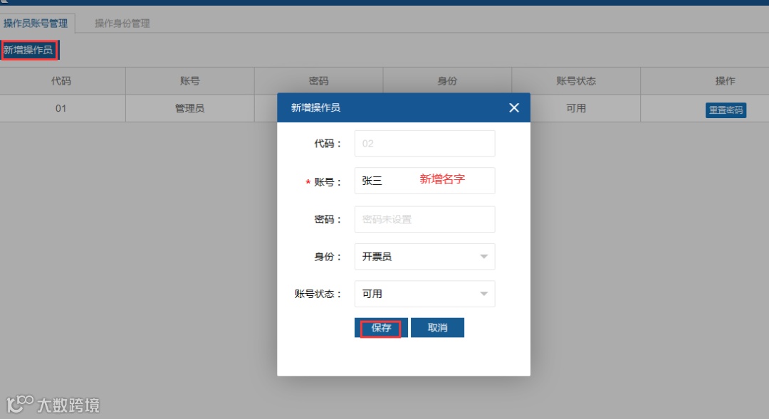 第二步:点击新增操作员,在账号栏输入需要增加的开票人的名称,可以依次多增加几个名称作为收款人和复核人。