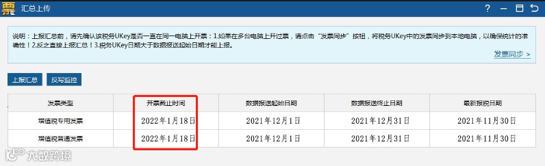 操作流程:重新打开汇总上传界面,查看各发票类型开票截止时间是否更新,若更新,说明操作成功。