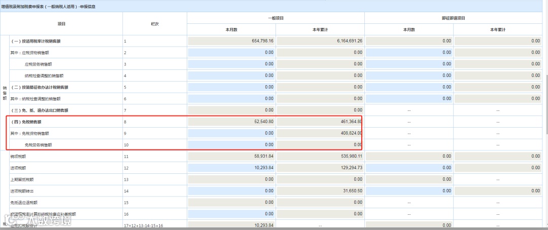 返回到增值税及附加税费申报表主表,主表项目看免税销售额哦,在第8、9、10行显示,一般情况下数据都是一致的,但是也要记得核对下填列数据是否一致~不一致就要核实一下原因了~