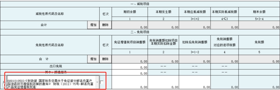 以图2为例,此纳税人是混营纳税人,既有一般征税项目,又从事免税项目,免税项目适用的免征增值税优惠政策是鲜活肉蛋的免征增值税优惠政策,添加行次后,可以直接在免税性质代码及名称项目里选择适用鲜活肉蛋的免征增值税优惠政策,然后根据实际业务发生情况分别在免征增值税项目销售额、免税销售额扣除项目本期实际扣除金额两个栏次填列相应数据即可~