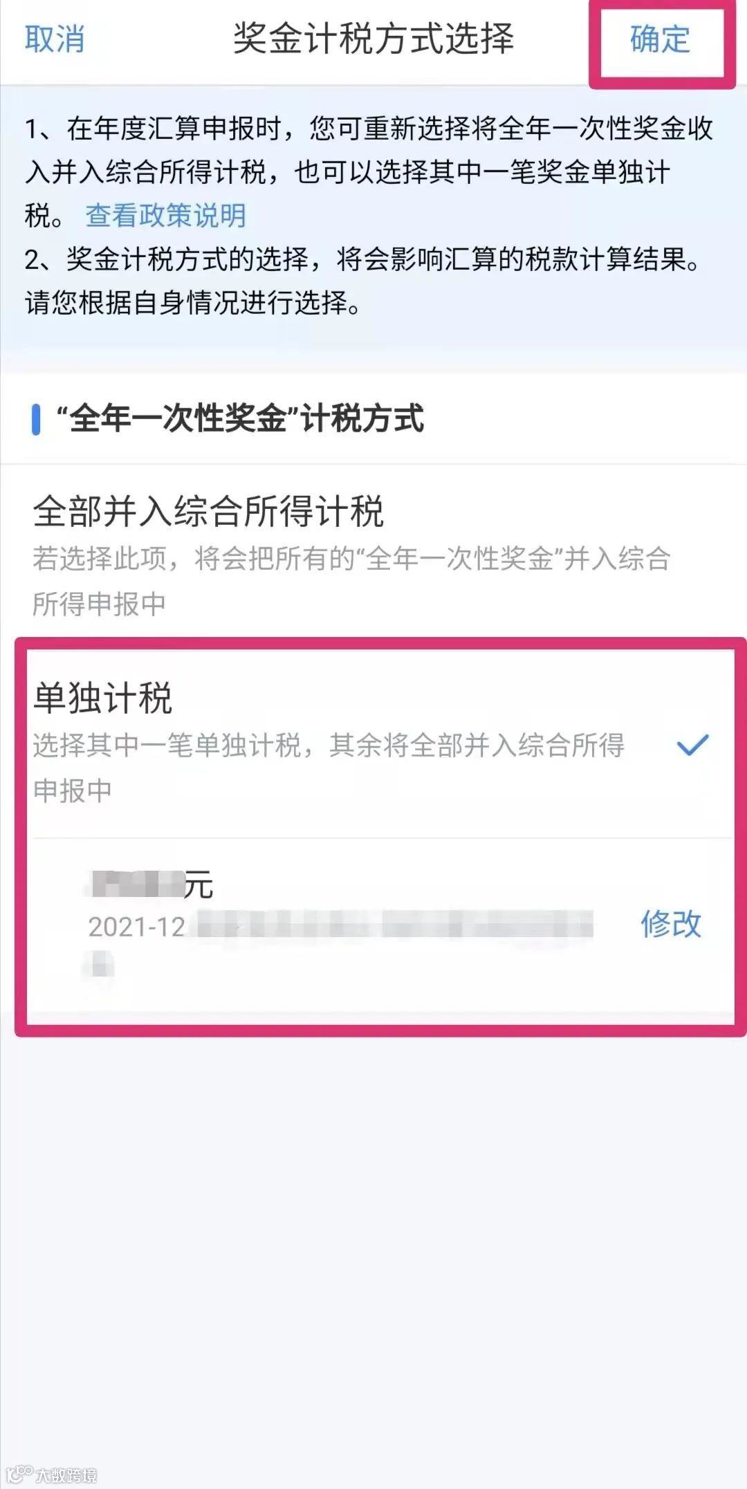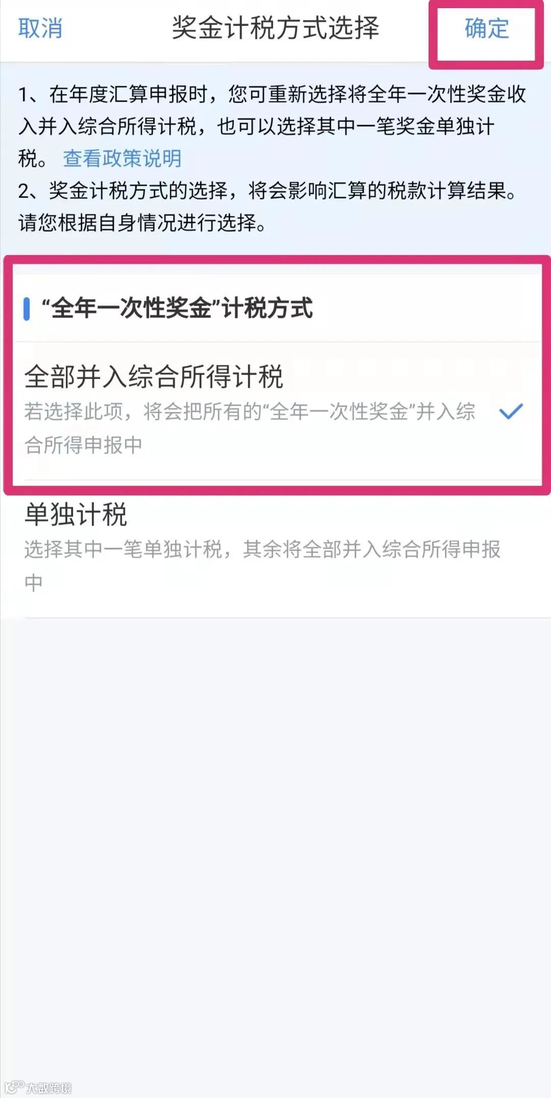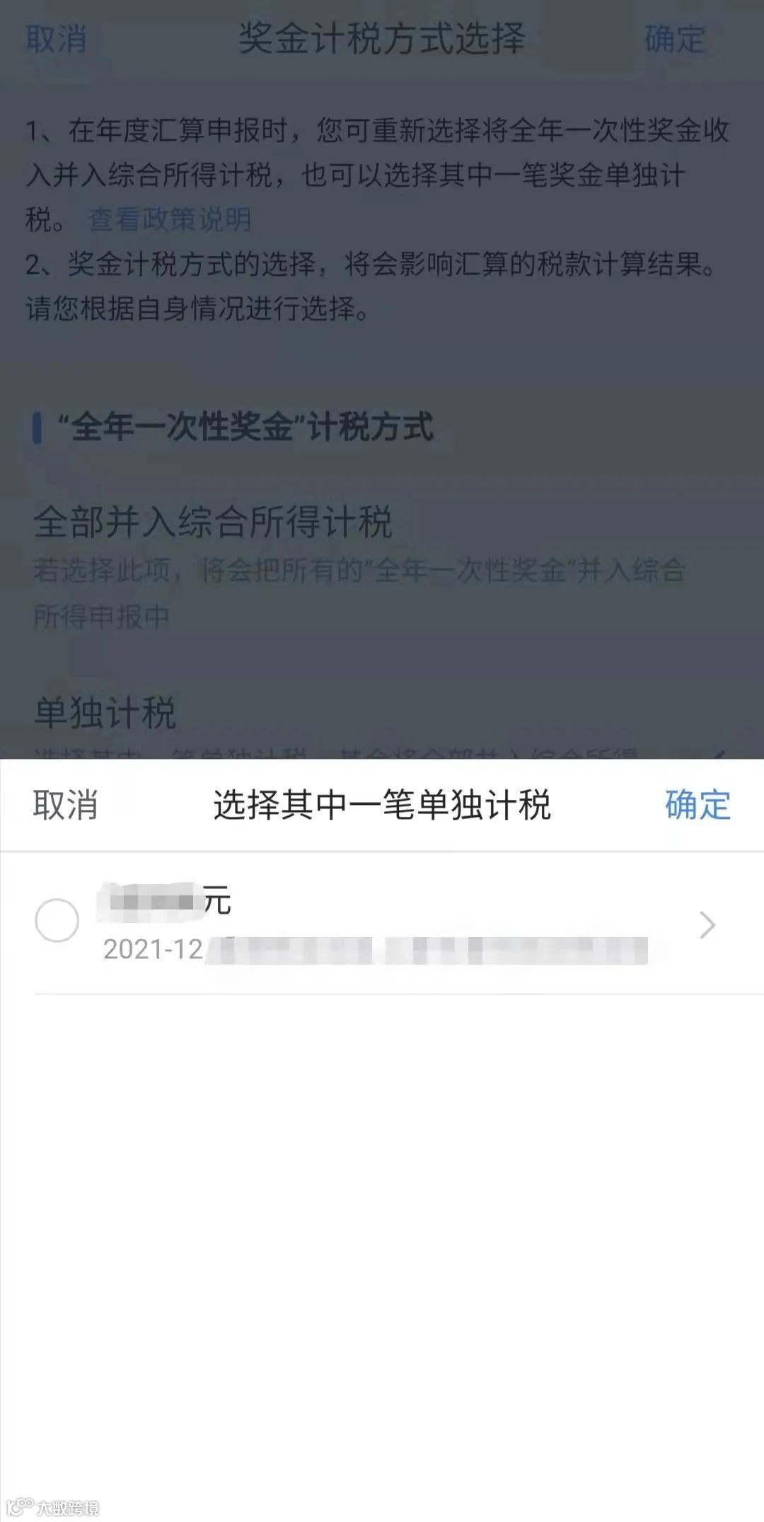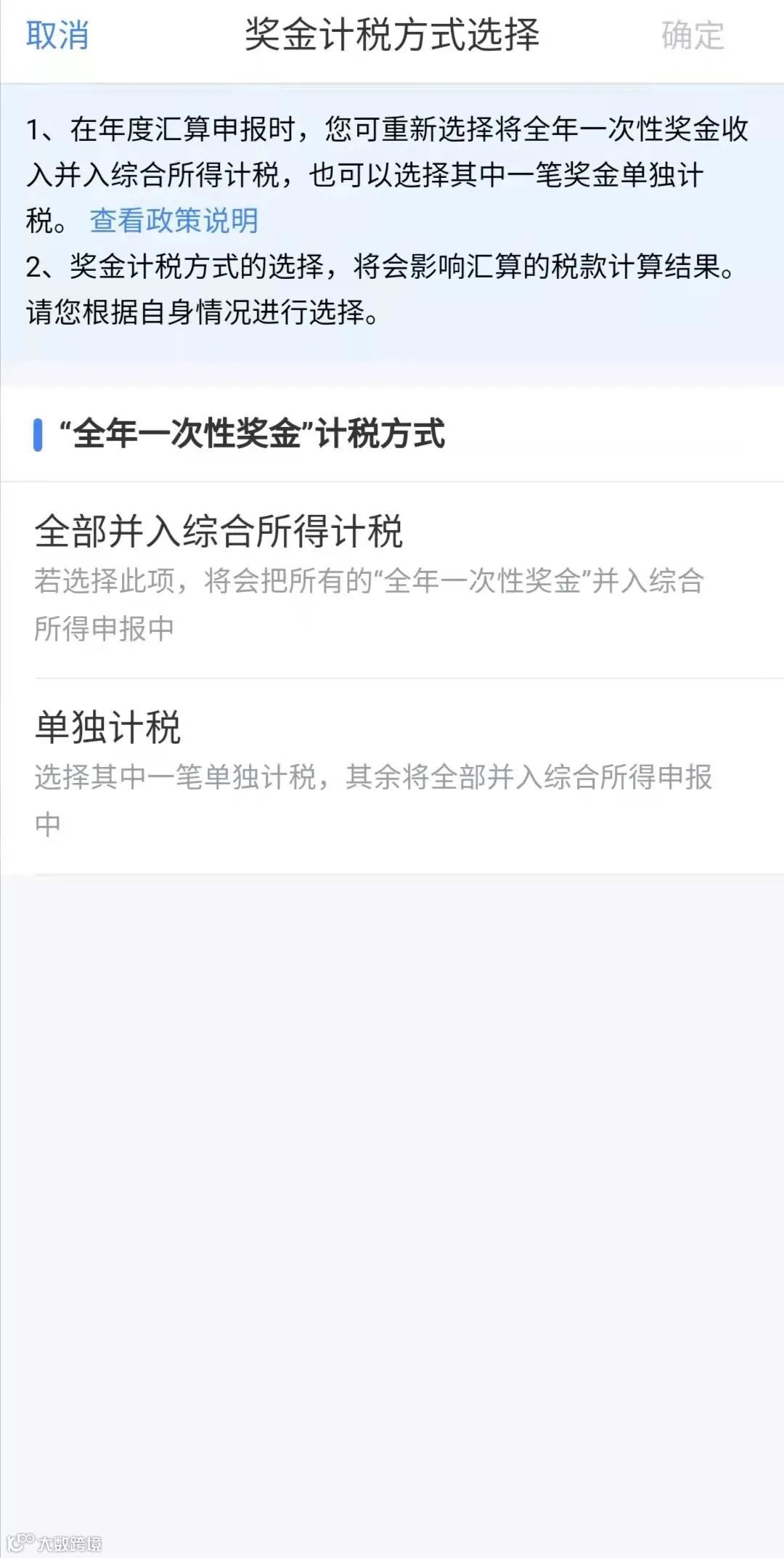 点击提示,您可以看到,全年一次性奖金有两种计税方式,可选择其中一笔作为单独计税,也可选择并入综合所得。