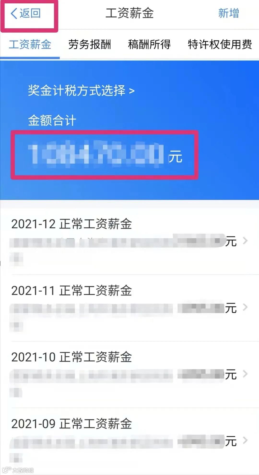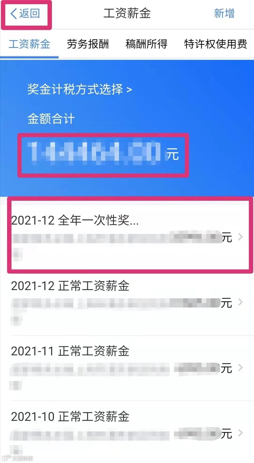 如您想要全年一次性奖金单独计税,选择“单独计税”——系统会显示您的全年一次性奖金申报信息——勾选后点击确定——“奖金计税方式选择”右上角点击“确定”,“工资薪金”明细页面会展示您的工资薪金合计及明细(不包含全年一次性奖金),确认无误后点击左上角“返回”,此时您的申报页面、收入栏“工资薪金”的金额不包括全年一次性奖金的金额。