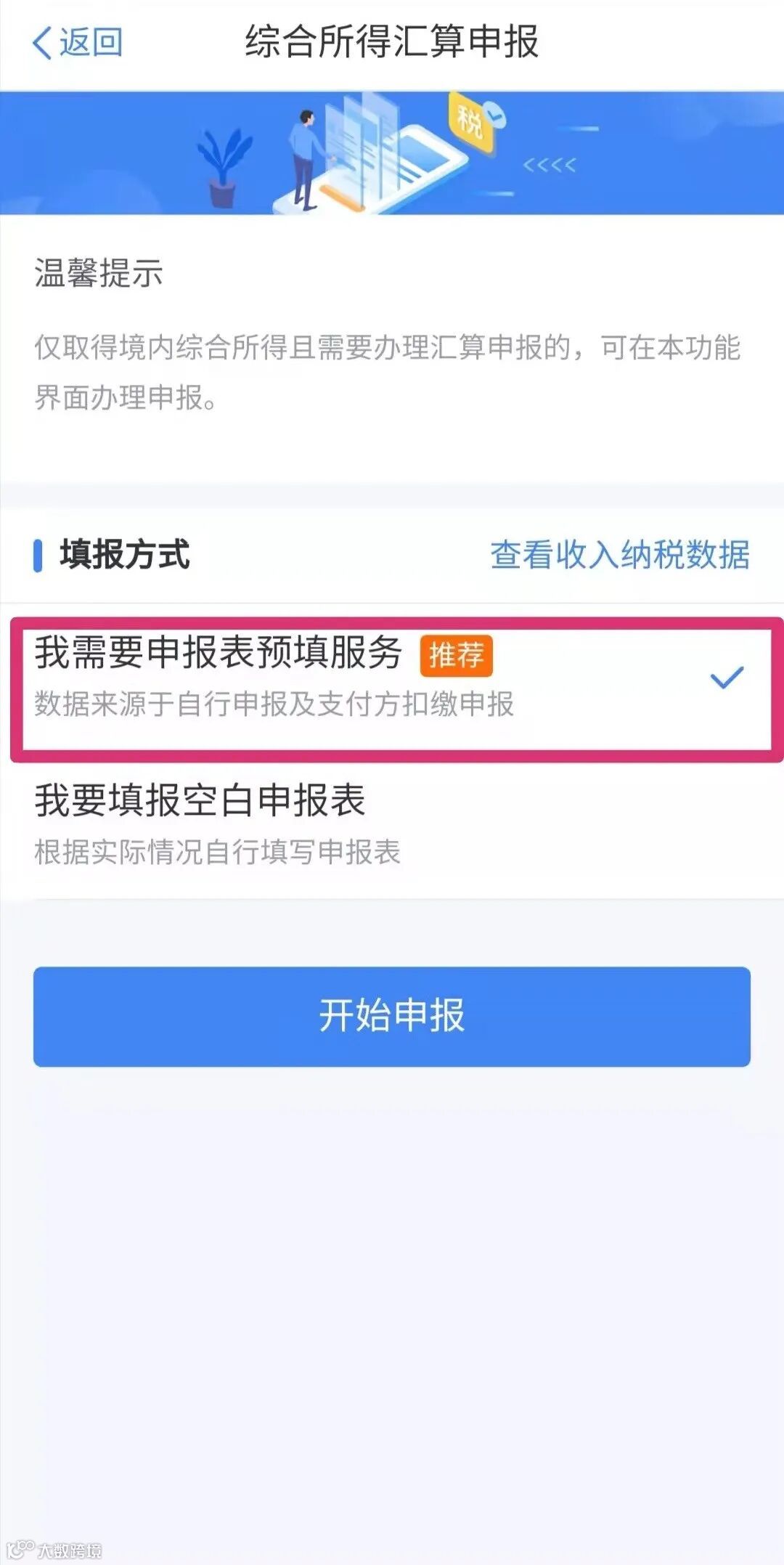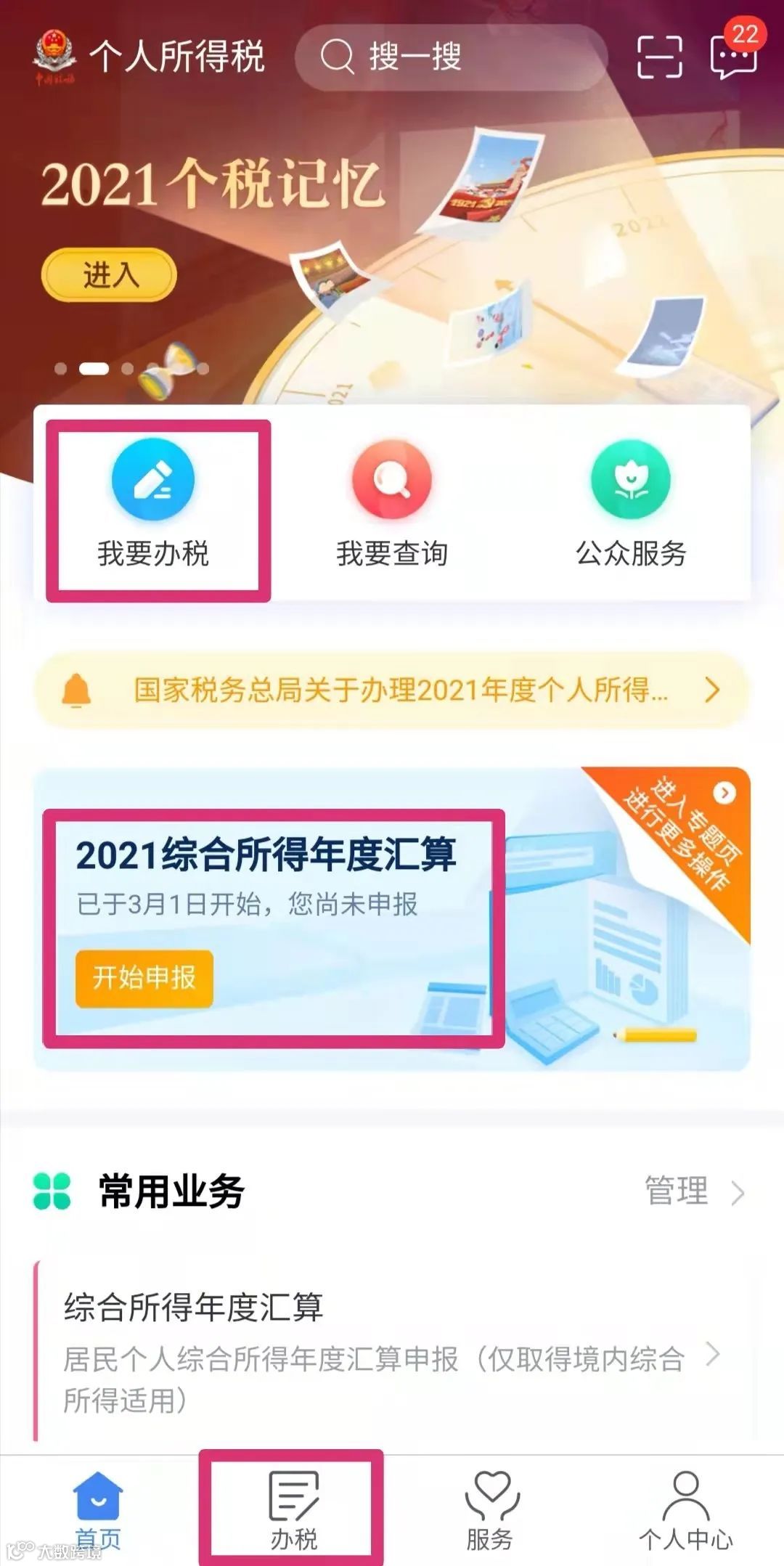 首先登录个人所得税手机APP,进入首页后,查看“2021综合所得年度汇算”专题——点击“开始申报”,或通过首页上方“我要办税”、首页下方的“办税”——综合所得年度汇算”发起申报。