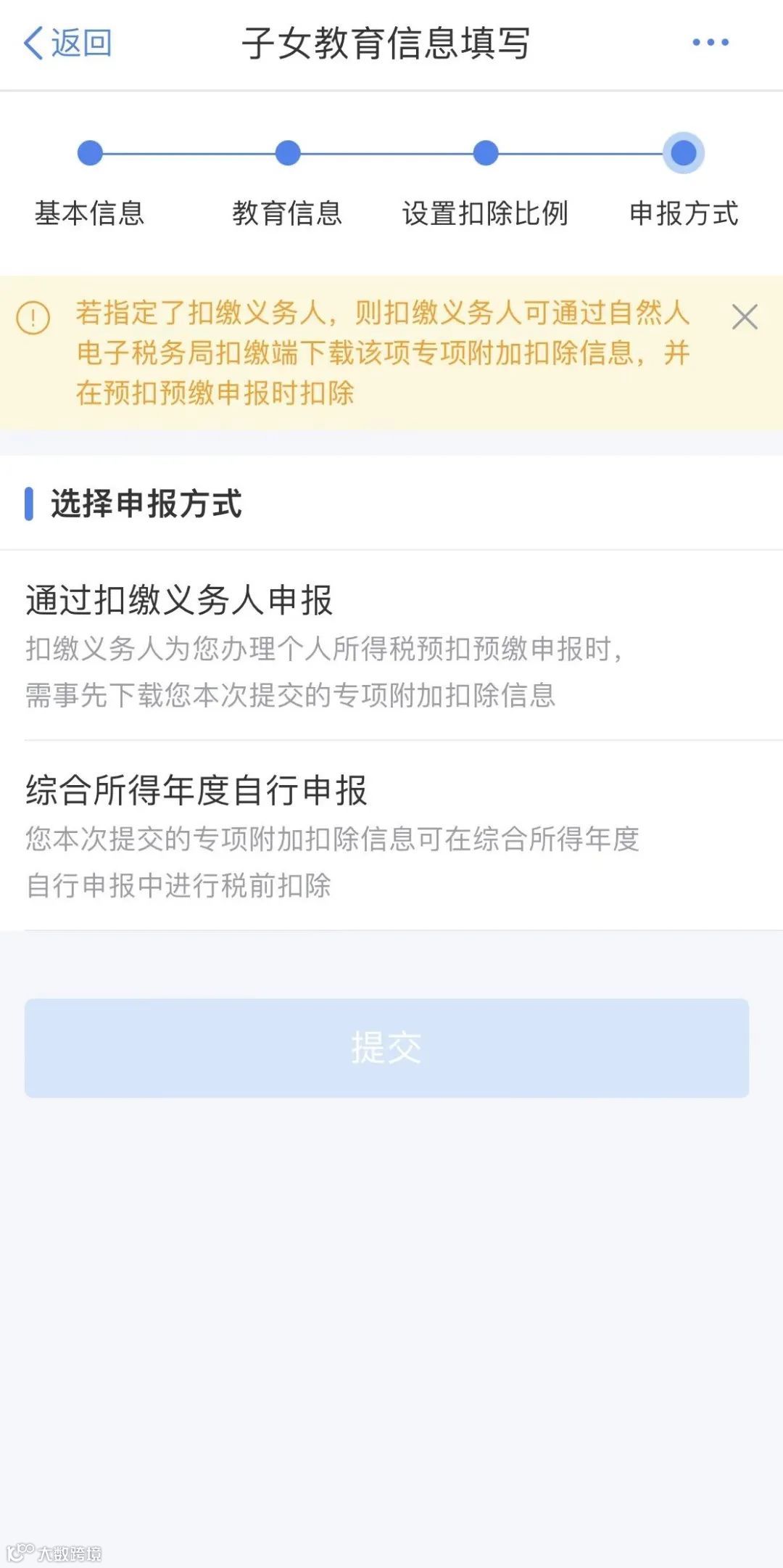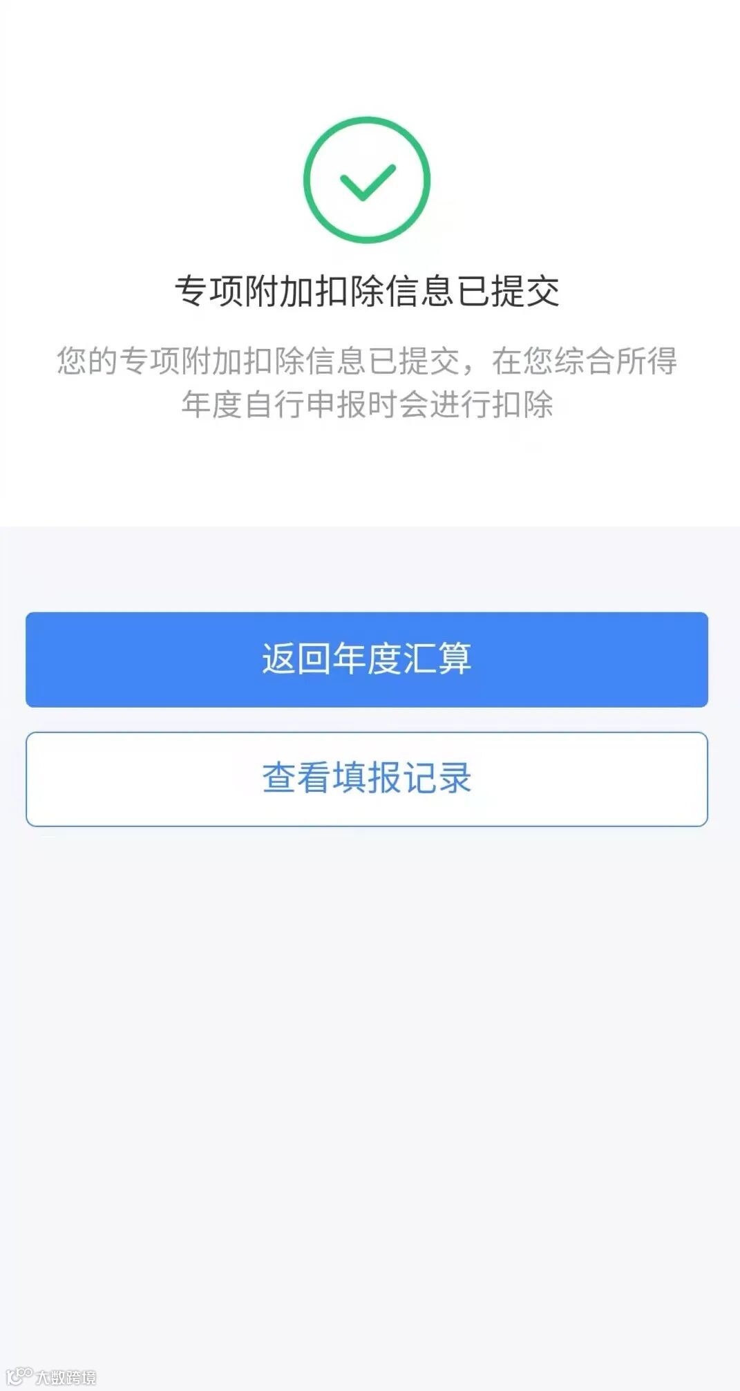 选择好扣除比例后,点击“下一步”——通过“综合所得年度自行申报”享受符合条件的专项附加扣除,选择完成后点击“提交”,即可完成填报,填报成功后,可点击返回年度汇算继续申报。