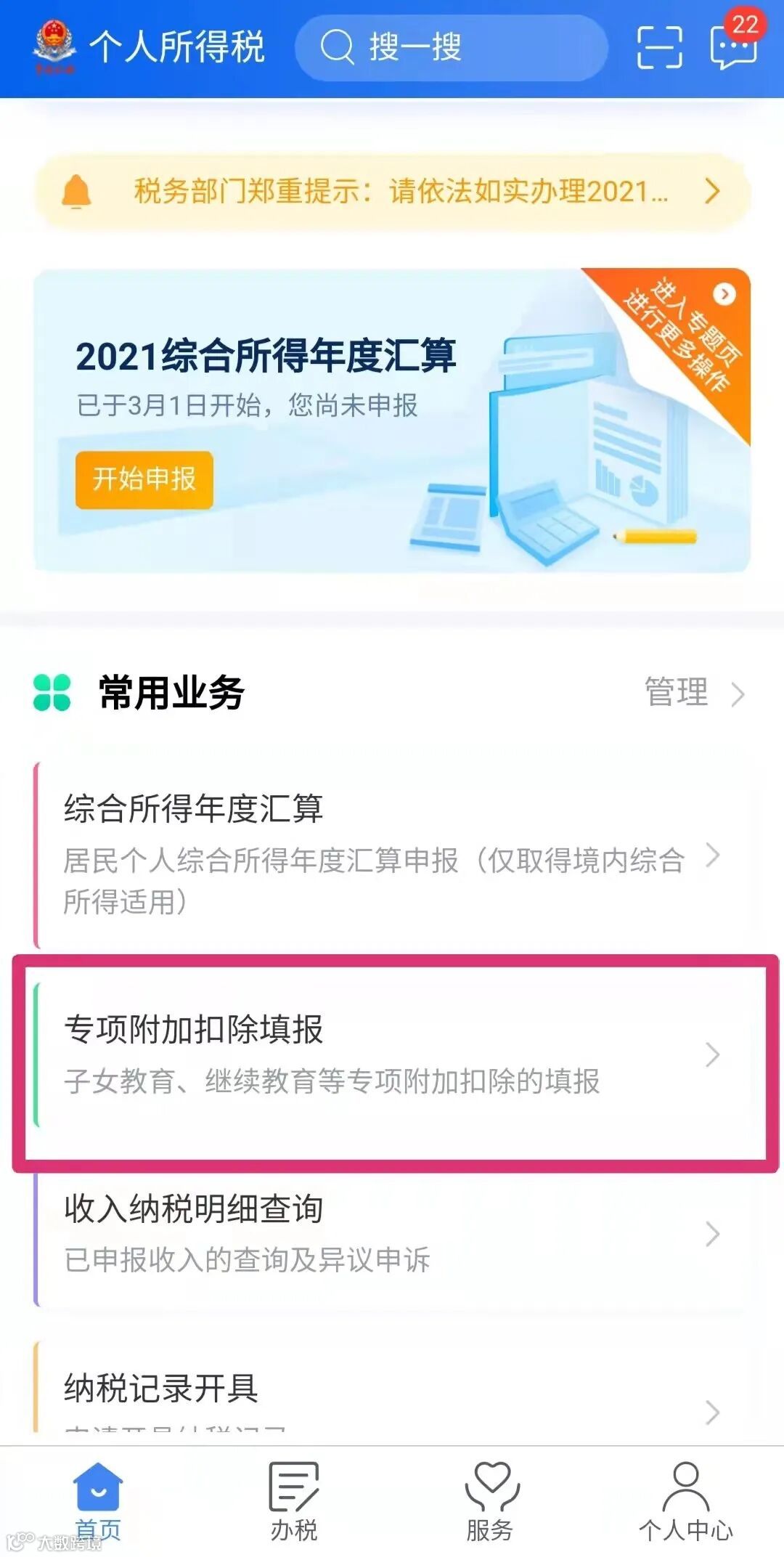 您可以在年度汇算的“收入和税前扣除”确认界面,填报符合条件的专项附加扣除;也可直接通过首页——“专项附加扣除填报”填报。