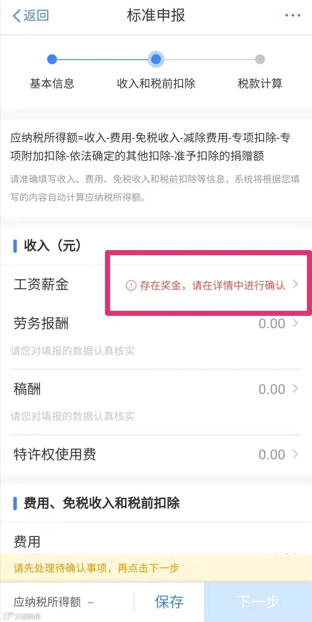 进入申报界面,您可选择使用预填服务,也可使用空白申报表申报,建议选择“我需要申报表预填服务”,方便准确又快捷。选择好后——阅读并点击“我已阅读并知晓”——选择确认“任职受雇单位”——点击“下一步”——进入“收入和税前扣除”确认,如果您在2021年度存在奖金,“收入”-“工资薪金”右侧会看到“存在奖金,请在详情中进行确认”的提示。