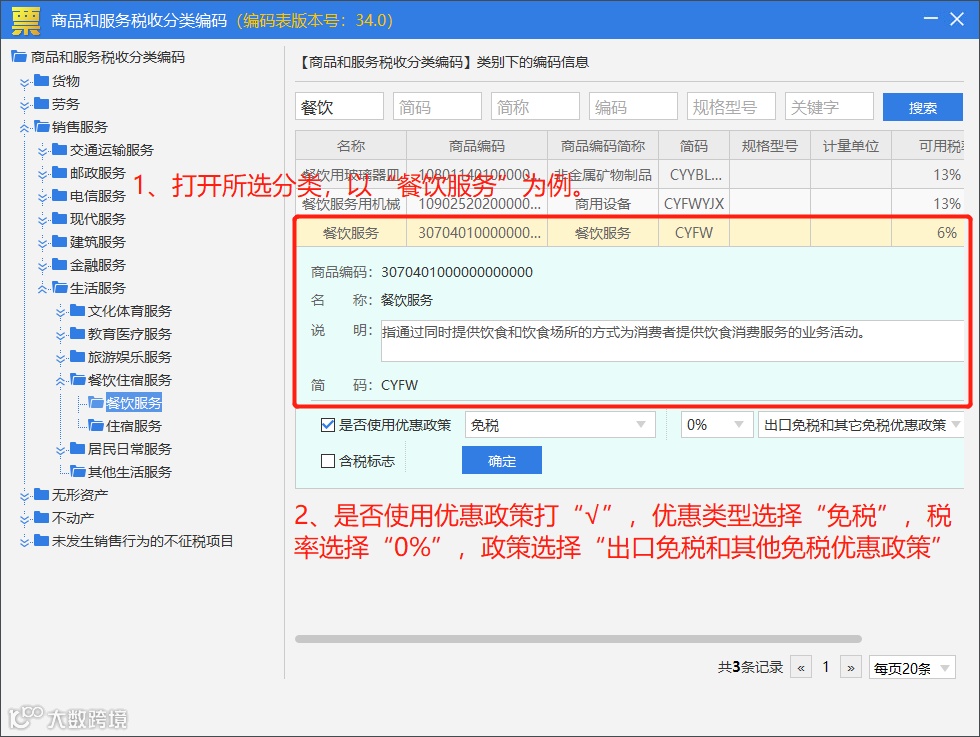 点击【赋码】后,可在名称框中输入商品的关键词后进行【搜索】,以餐饮服务为例。