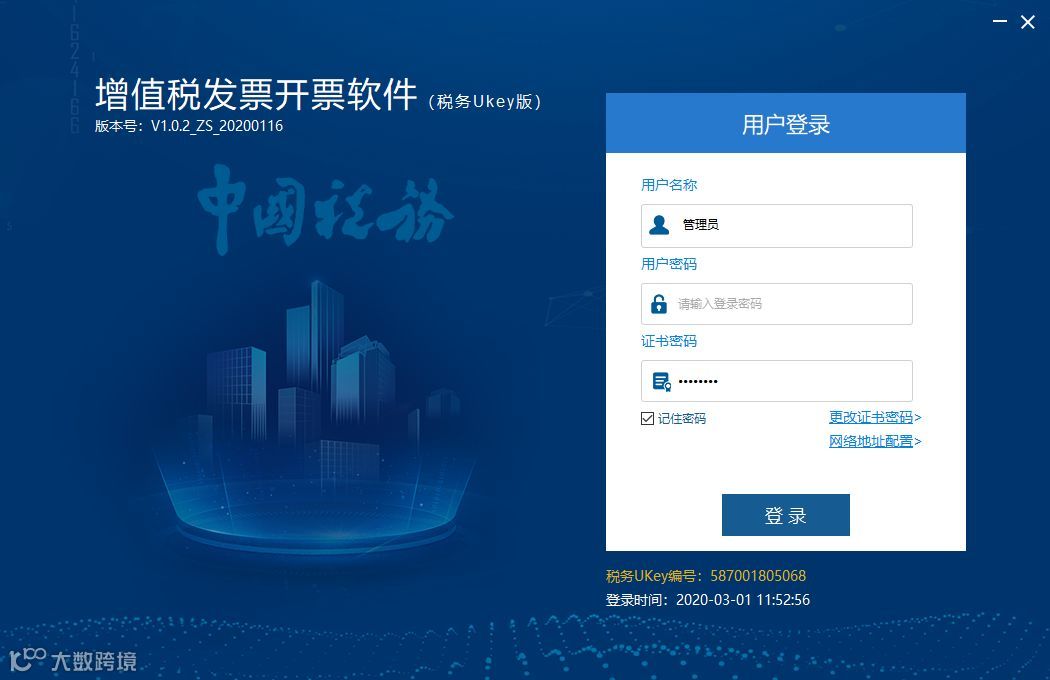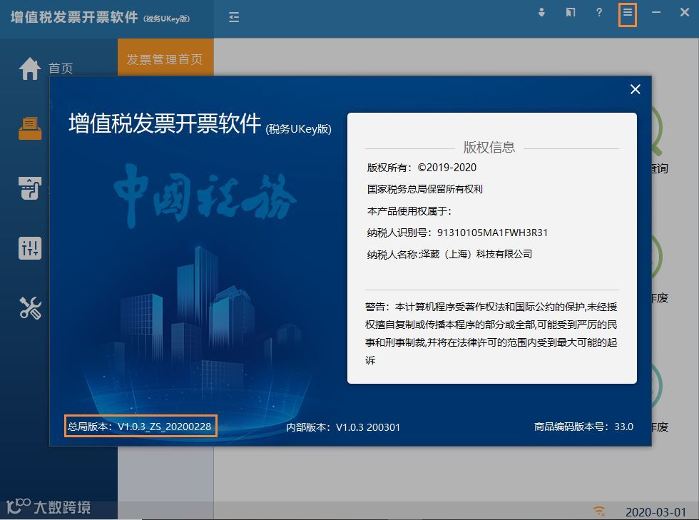 进入开票软件,点击【菜单】-【关于】,查看左下角增值税发票开票软件(税务Ukey版)版本号为V1.0.3_ZS_20200228则说明升级成功。