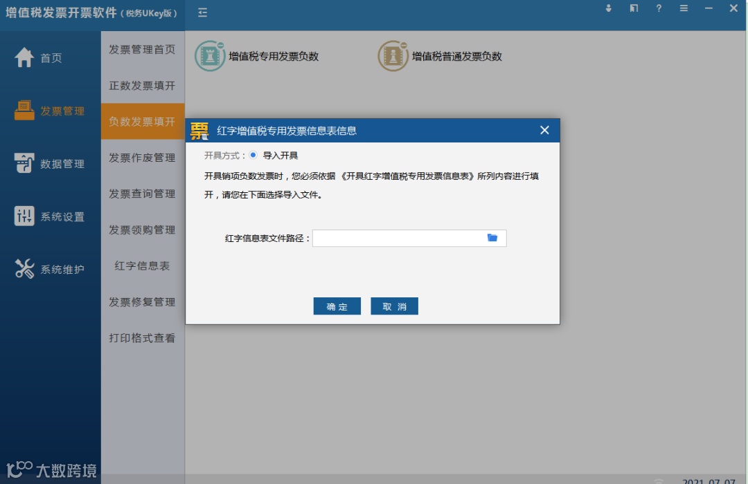 然后我们在发票管理—负数发票填开—增值税专用发票负数界面进行负数发票填开,选择导入开具,将桌面的红字信息表导入进来,点击确定,即可生成增值税专用负数发票。