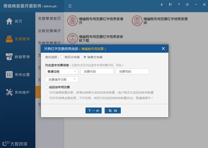以销售方为例,我们填写好对应蓝字发票的代码跟号码及发票开具日期,确认无误以后,点击下一步。根据提示上传后直至审核通过。