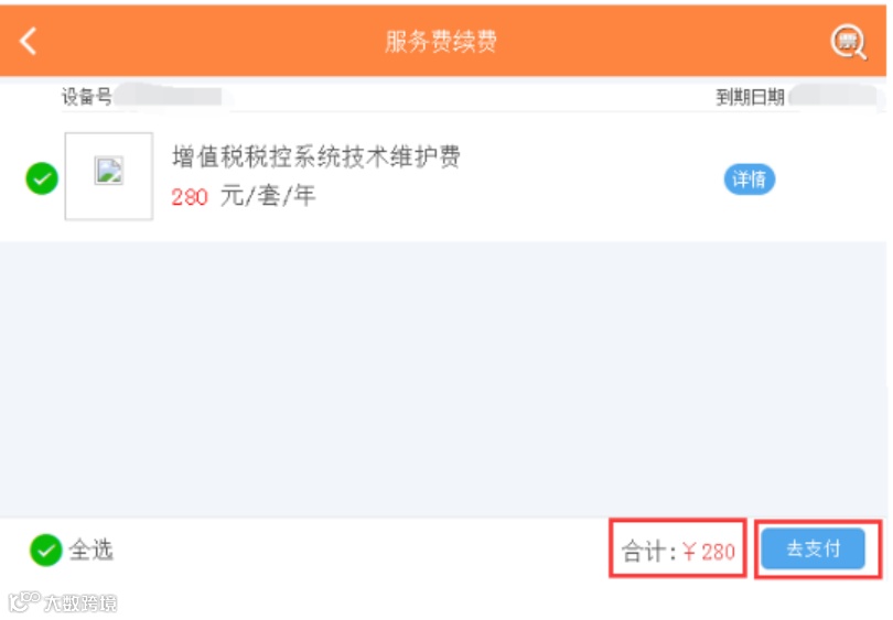 系统自动带出服务费相关信息,核实无误后,点击“去支付”;