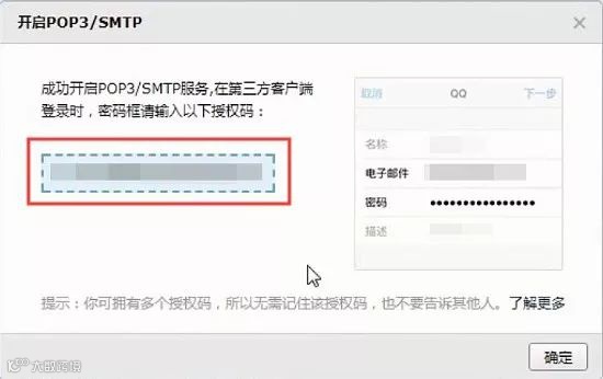 ④将获取的授权码复制,粘贴至【邮件SMTP授权码】。点击【确定】。