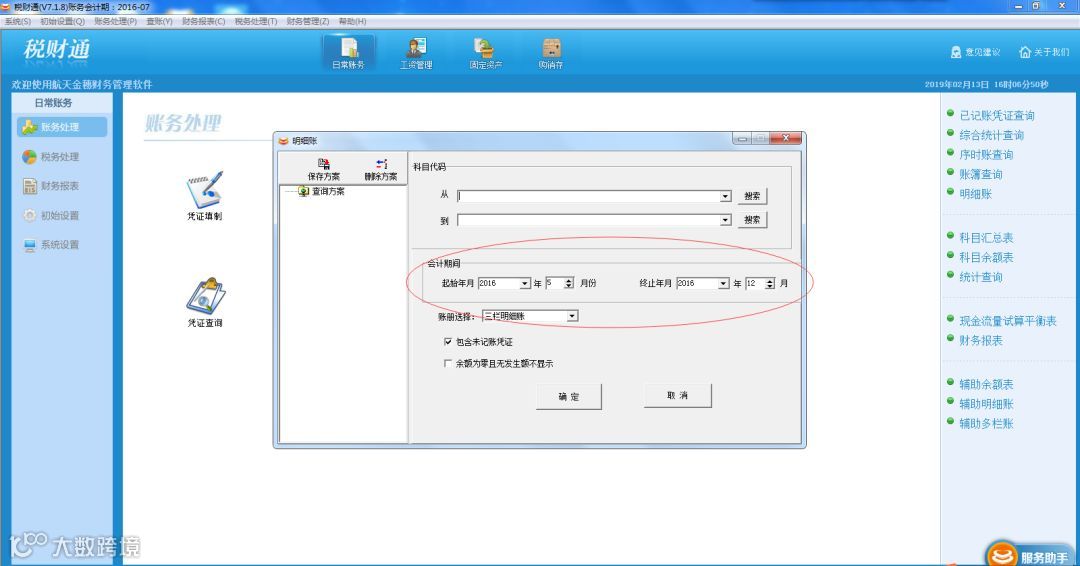 税财通打通跨年度账套,即便是基础版软件,也提供了集成SQL Server数据库的跨年查账功能。相较于先退出当年账套,再进入上一年账套,然后再输入月份查询的流程,税财通只需要您点击输入年度月份点确定,直接可以查询。