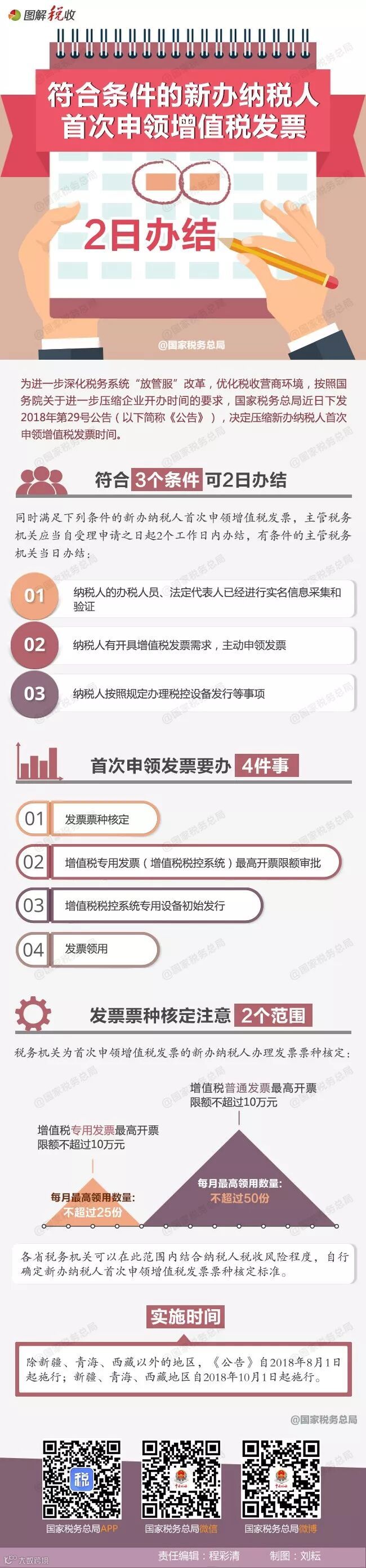 为了进一步深化税务系统“放管服”改革,优化税收营商环境,方便新办纳税人首次申领增值税发票,国家税务总局近日发布《关于新办纳税人首次申领增值税发票有关事项的公告》(国家税务总局公告2018年第29号),决定压缩新办纳税人首次申领增值税发票时间,符合相关条件的新办纳税人首次申领增值税发票,主管税务机关应当自受理申请之日起2个工作日内办结。戳图了解↓