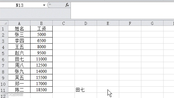 例如需要查找“田七”工资,公式为=VLOOKUP(D11,A:B,2,FALSE),此处的D11为要查找的对象;A:B为查找的区域;2是要查找对象在所选择的的区域的列数,此处为“第2列”;false为精确查找,匹配唯一值。