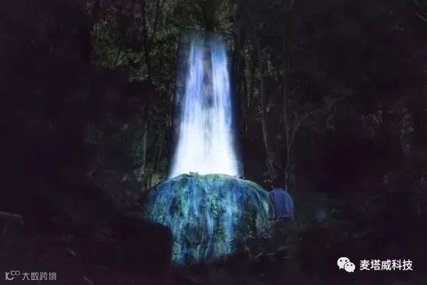 在御船山乐园内的稻荷大明神巨石,被重现于这片假想的三次元空间之中。利用光影艺术模拟出瀑布坠落岩石之上的壮观景象。