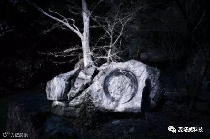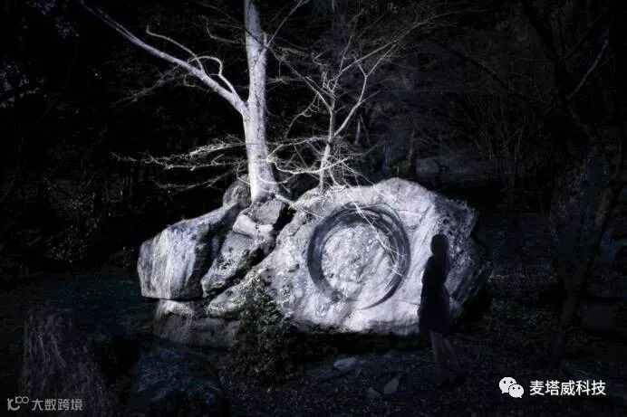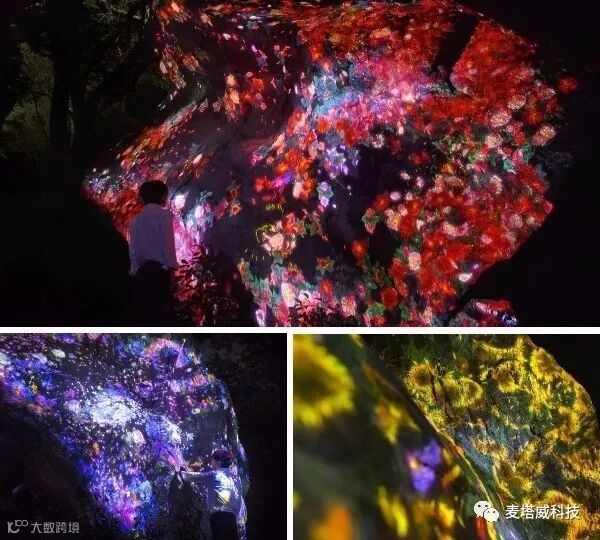在长满苔鲜的巨石(高5.5m宽4.6m深6.5m)之上,无数的光影花朵会不断重复着盛开、凋零、散落的整个过程。作品会在一个小时之内,呈现出这里一年四季花开花落的景象。