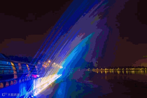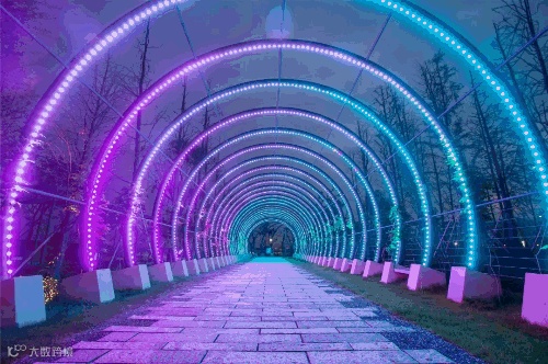 水云霓虹:使用3500颗LED灯珠,并结合多媒体打造夜晚的五彩紫藤长廊,实现自然、艺术与光影的完美结合。一道道颜色渐变的灯弧架在桥上,充满现代感与科技感,像是一个时间通道,走过去便到了未来。
