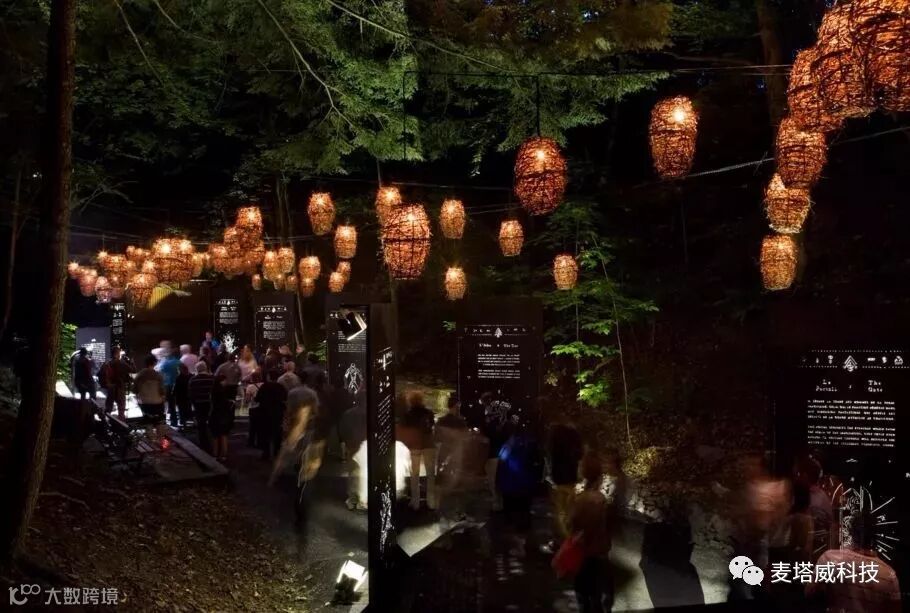 随后参与者便踏上了一段2公里蜿蜒曲折的小路,就此奇幻之旅开始,在小路的上方挂着精心制作的竹灯笼,光影照射在斑驳的小路上带来一种启示性的美感。随处可见的屏风上写着警语:“请小心出没的精灵”。